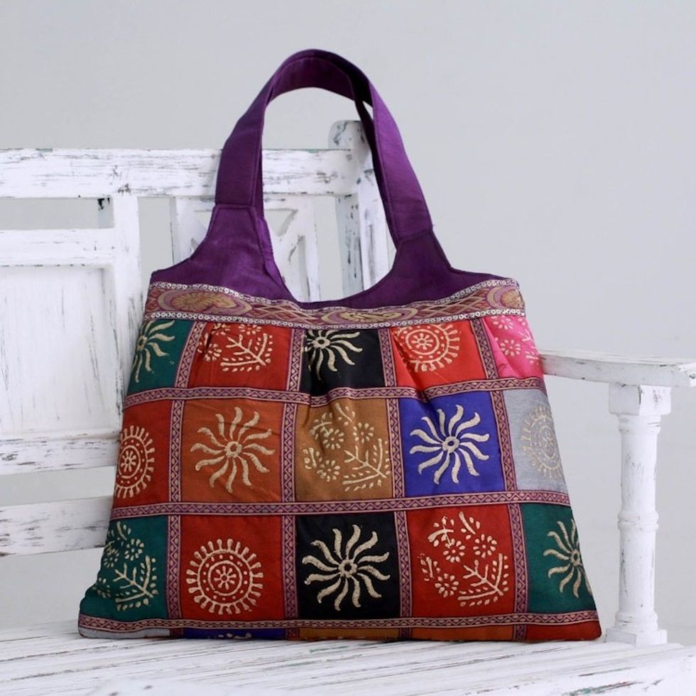 Purple Tote Handbag with Golden Block Prints 'Purple in Kutch' Item ID: 2671793205