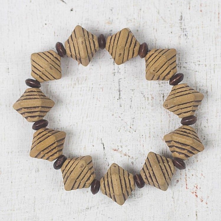 Pyramid-Shaped Wood and Recycled Plastic Stretch Bracelet 'Eco Pyramids' Item ID: 2671806266