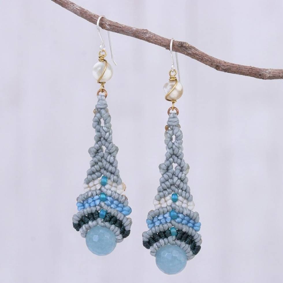 Quartz and Agate Macrame Beaded Dangle Earrings 'Raindrop in Blue' Item ID: 2671800441