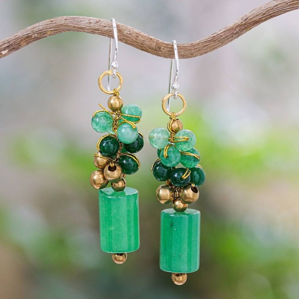 Quartz and Brass Beaded Dangle Earrings with Silver Hooks 'Green Touch' Item ID: 2669927265