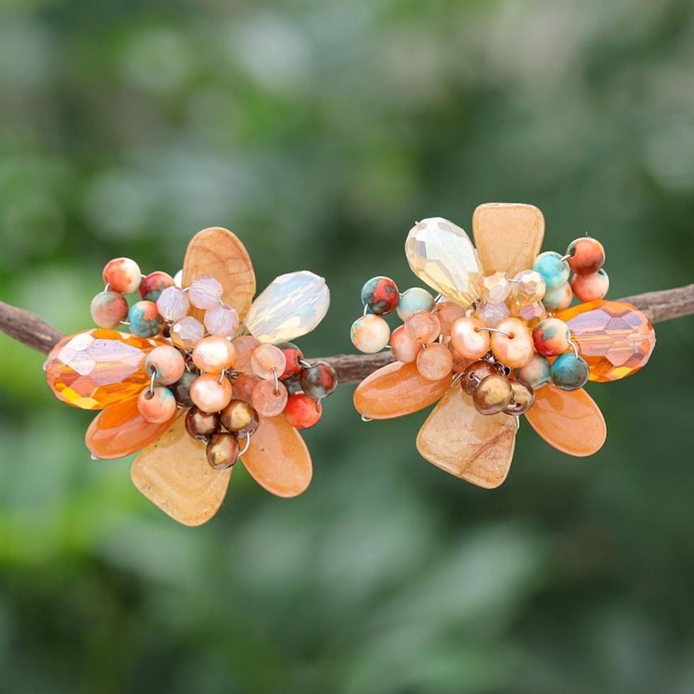 Quartz and Cultured Pearl Cluster Clip-On Earrings 'Solaris in Orange' Item ID: 2669926263