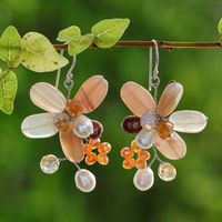 Quartz and Cultured Pearl Dangle Earrings from Thailand 'Elegant Flora' Item ID: 2671800639