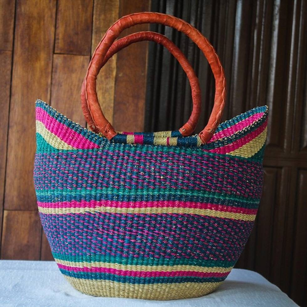 Raffia and Leather Shopping Basket from Ghana 'Kanea' Item ID: 2671806519