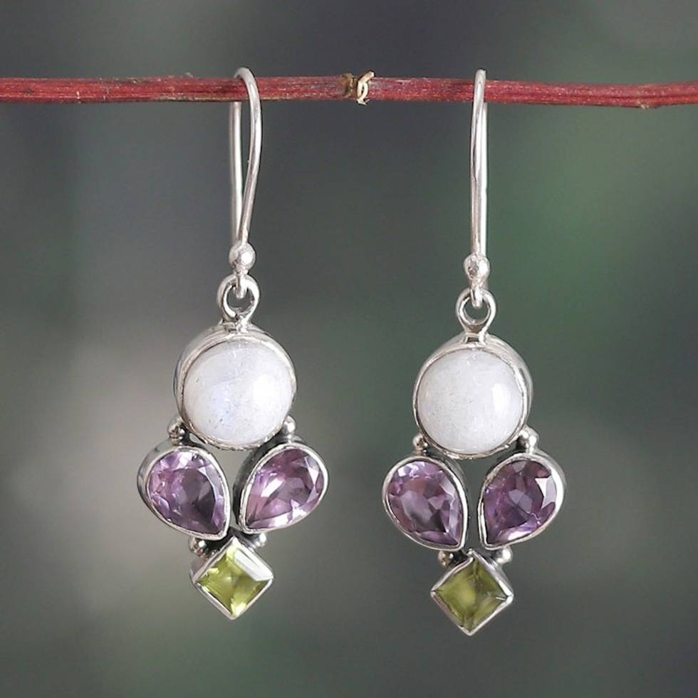Rainbow Moonstone Amethyst Peridot Silver Dangle Earrings 'Glamorous Harmony' Item ID: 2671781147