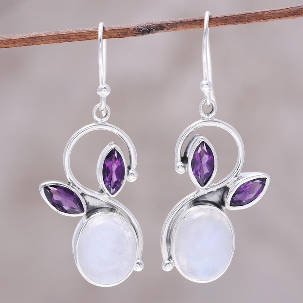 Rainbow Moonstone Amethyst Sterling Silver Dangle Earrings 'Moonglow Bloom' Item ID: 2669924769