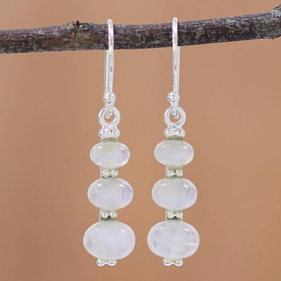 Rainbow Moonstone and 925 Silver Dangle Earrings from India 'Natural Ellipses' Item ID: 2671790171