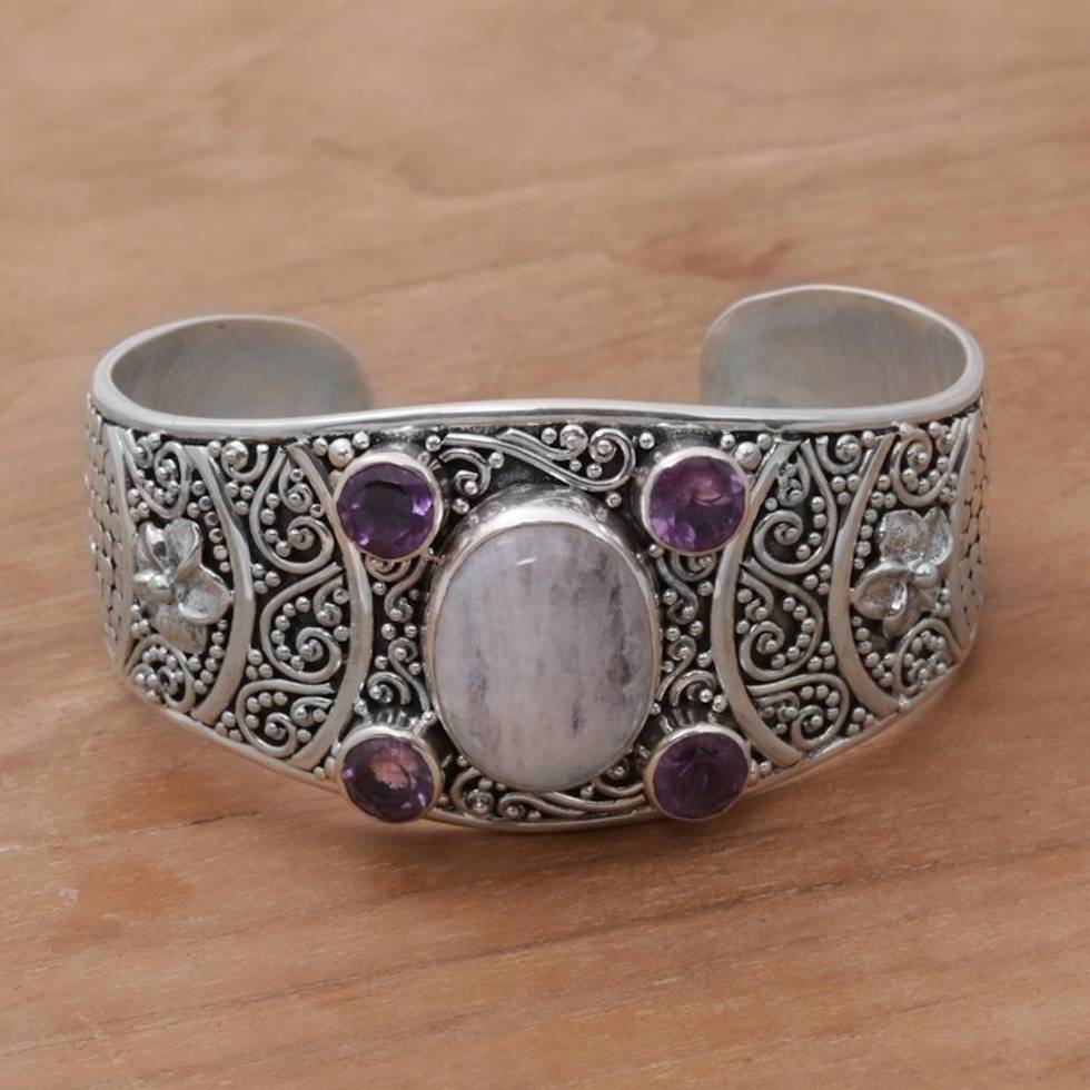 Rainbow Moonstone and Amethyst Cuff Bracelet from Bali 'Misty Bouquet' Item ID: 2669921496