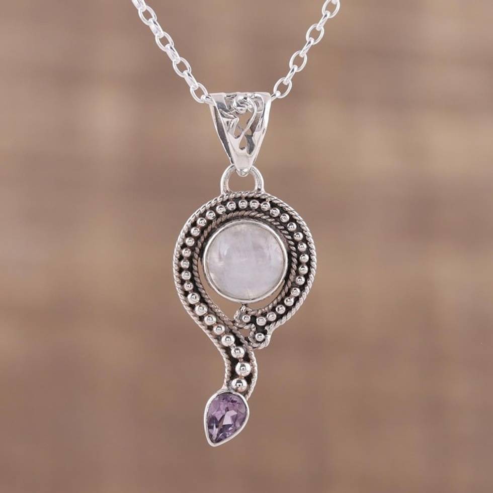 Rainbow Moonstone and Amethyst Pendant Necklace from India 'Graceful Query' Item ID: 2671790344