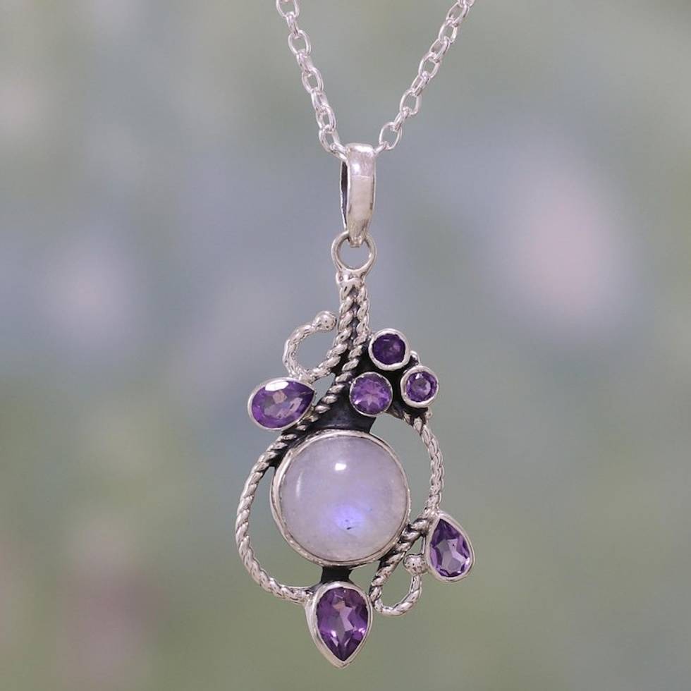 Rainbow Moonstone and Amethyst Pendant Necklace from India 'Misty Vine' Item ID: 2671791029