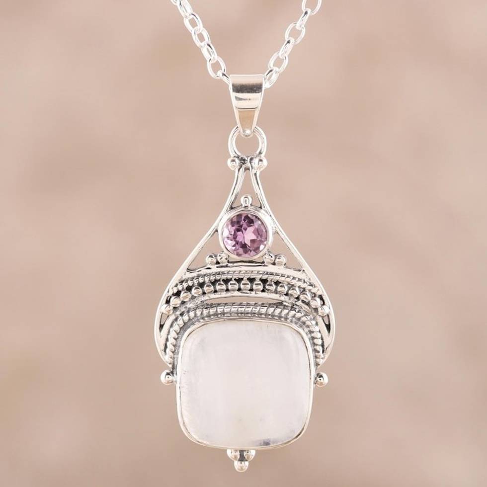 Rainbow Moonstone and Amethyst Pendant Necklace from India 'Undying Elegance' Item ID: 2671792695