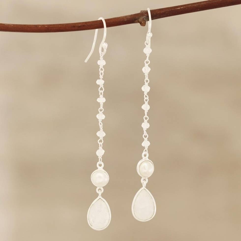 Rainbow Moonstone and Cultured Pearl Dangle Earrings 'Purest Harmony' Item ID: 2669941887