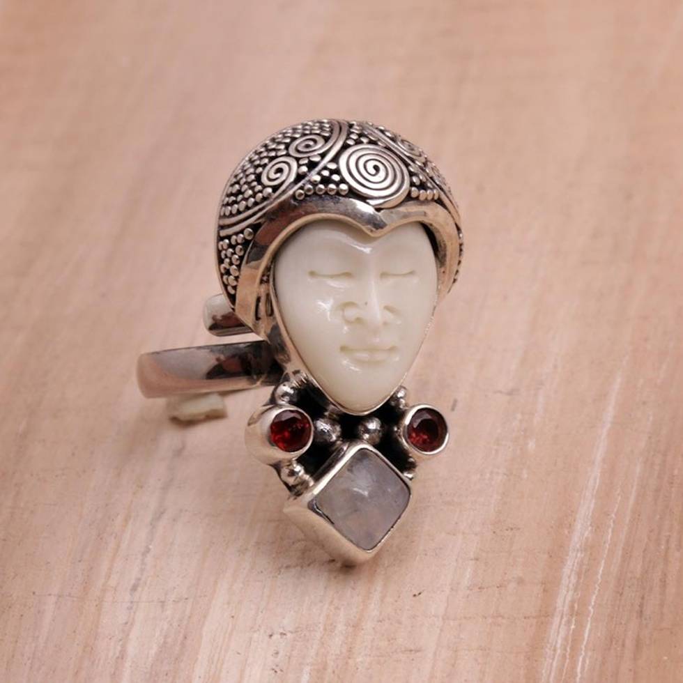 Rainbow Moonstone and Garnet Face Shaped Ring from Bali 'Honored Knight' Item ID: 2671735034
