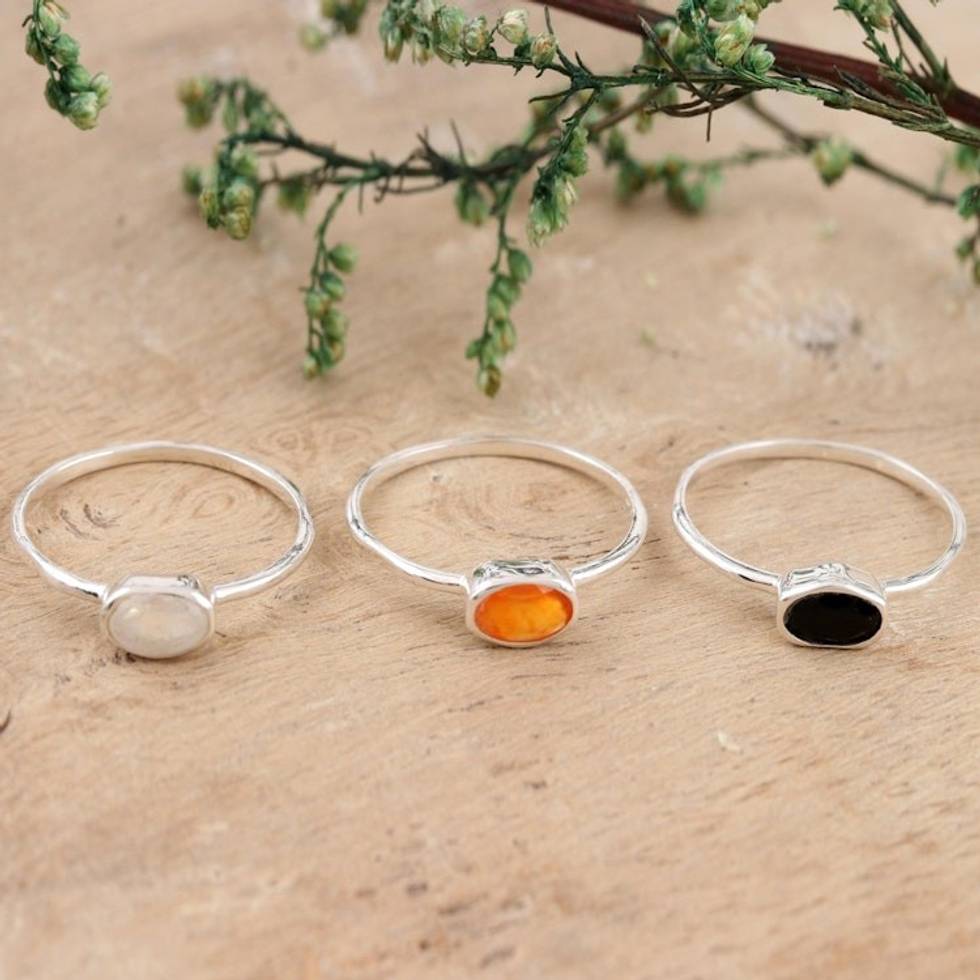 Rainbow Moonstone and Onyx Single Stone Rings Set of 3 'Underground Rumor' Item ID: 2671787282