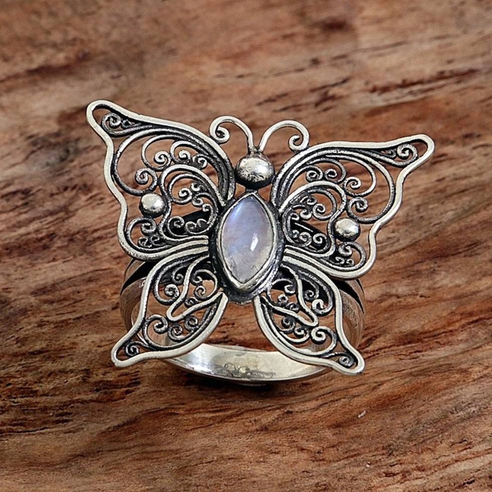 Rainbow Moonstone Butterfly Cocktail Ring from Indonesia 'Open Wings' Item ID: 2670122247