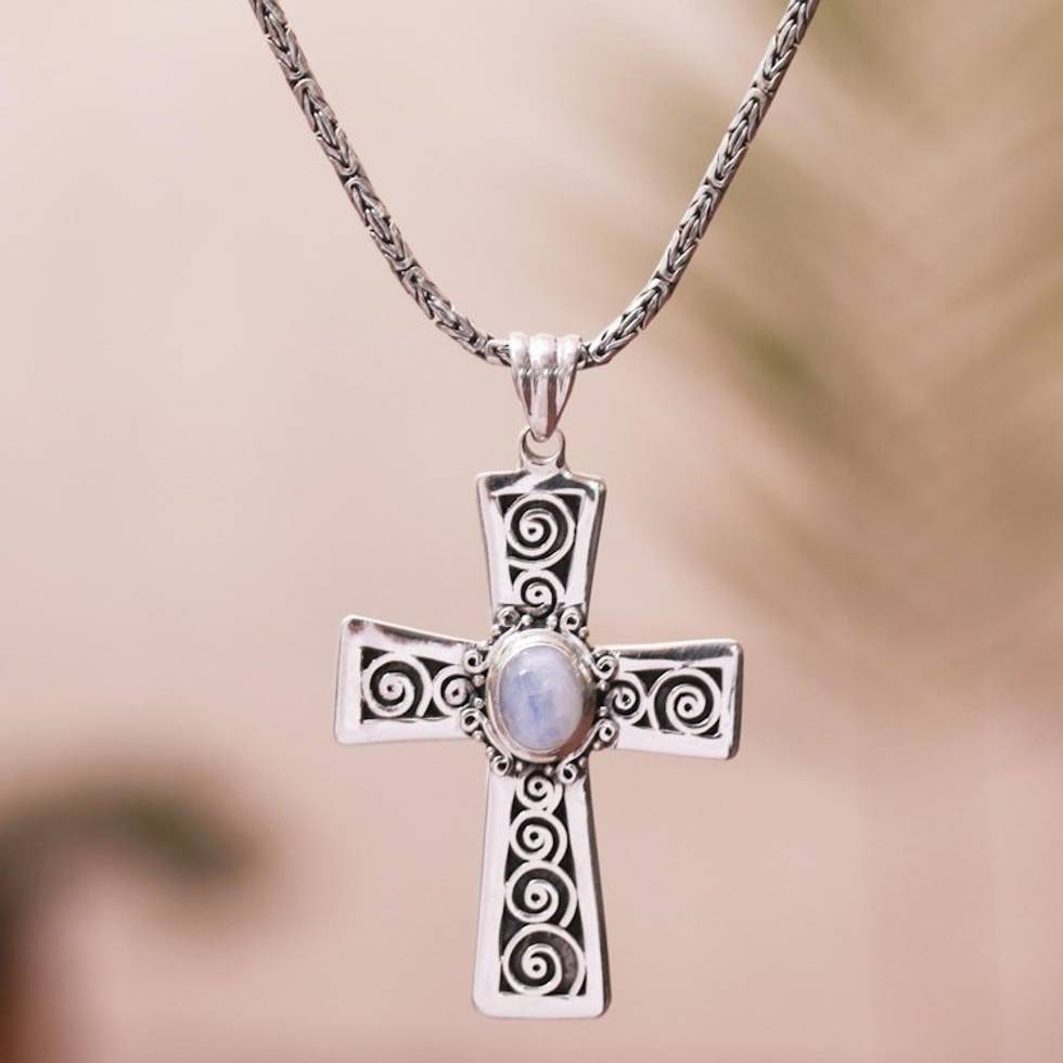 Rainbow Moonstone Cross Pendant Necklace from Bali 'Mesmerizing Faith' Item ID: 2671744950
