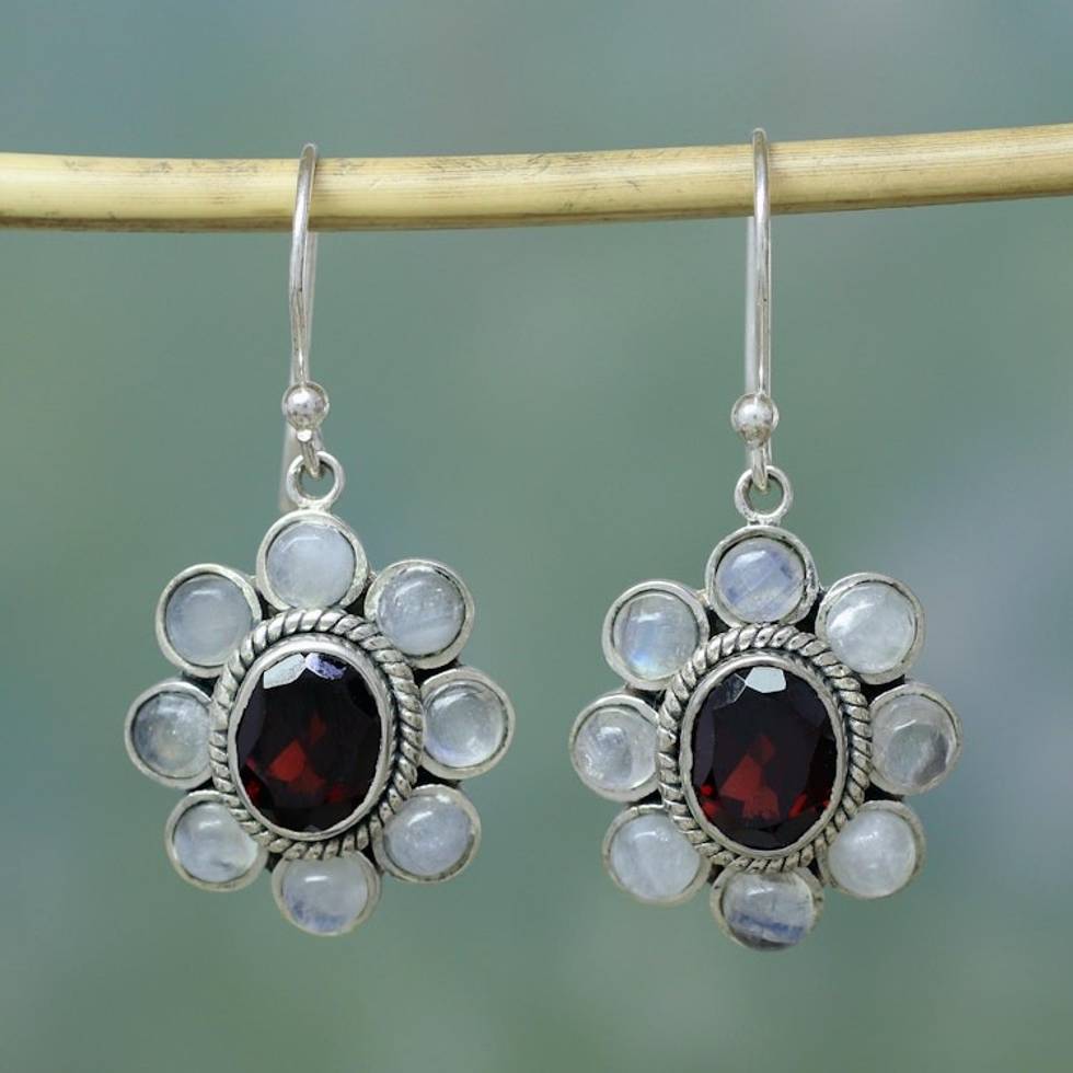 Rainbow Moonstone Garnet Sterling Silver Dangle Earrings 'Pure Radiance' Item ID: 2669943195