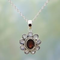 Rainbow Moonstone Garnet Sterling Silver Pendant Necklace 'Radiant Flower' Item ID: 2671793589