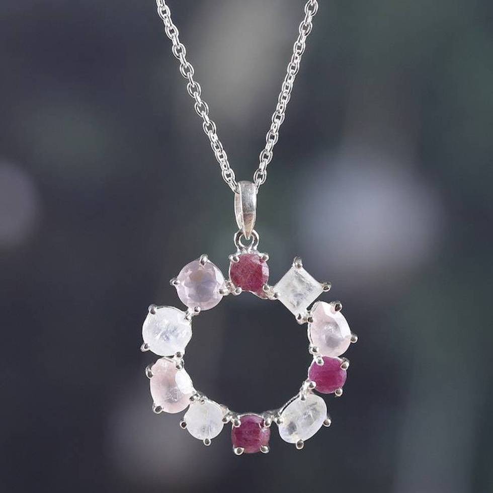 Rainbow Moonstone Rose Quartz Garnet Silver Pendant Necklace 'Vibrant Wreath of Gems' Item ID: 2676665101
