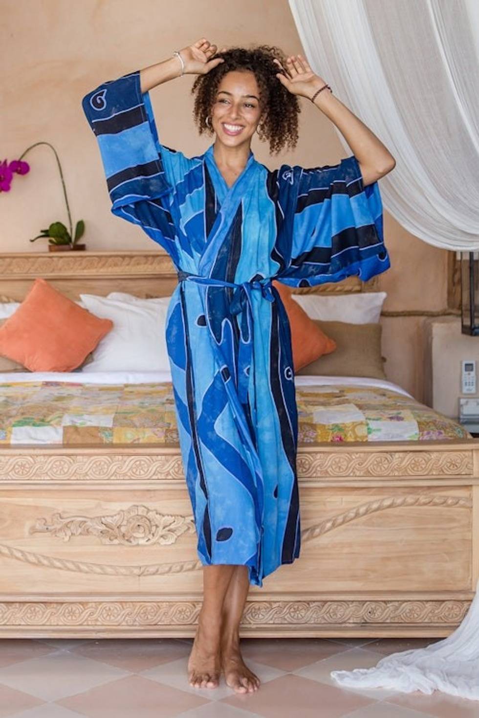 Rayon Batik Robe with Blue Abstract Pattern Crafted in Bali 'Cerulean Ocean' Item ID: 2671748600