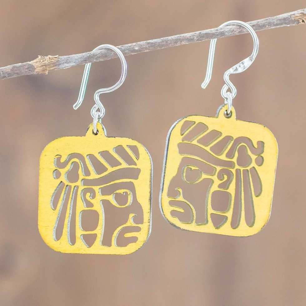 Reclaimed Wood Mayan Face Earrings in Yellow from Mexico 'Yellow Maya Mask' Item ID: 2671772122