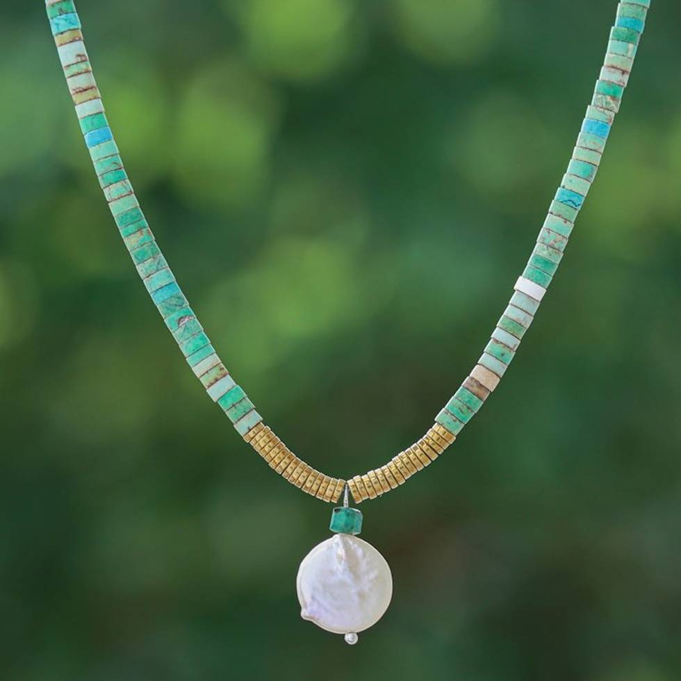 Recon Turquoise and Hematite Necklace with Pearl Pendant 'Lagoon Moon' Item ID: 2671796849