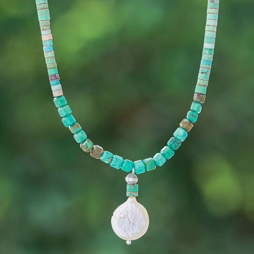 Reconstituted Turquoise Beaded Necklace with Pearl Pendant 'Aquatic Moon' Item ID: 2671797058