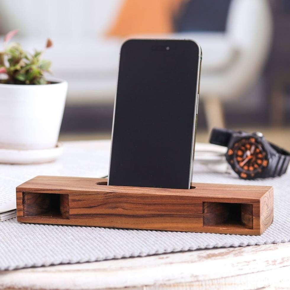 Rectangular Teak Wood Phone Speaker from Thailand 'Teak Orchestra' Item ID: 2671799120