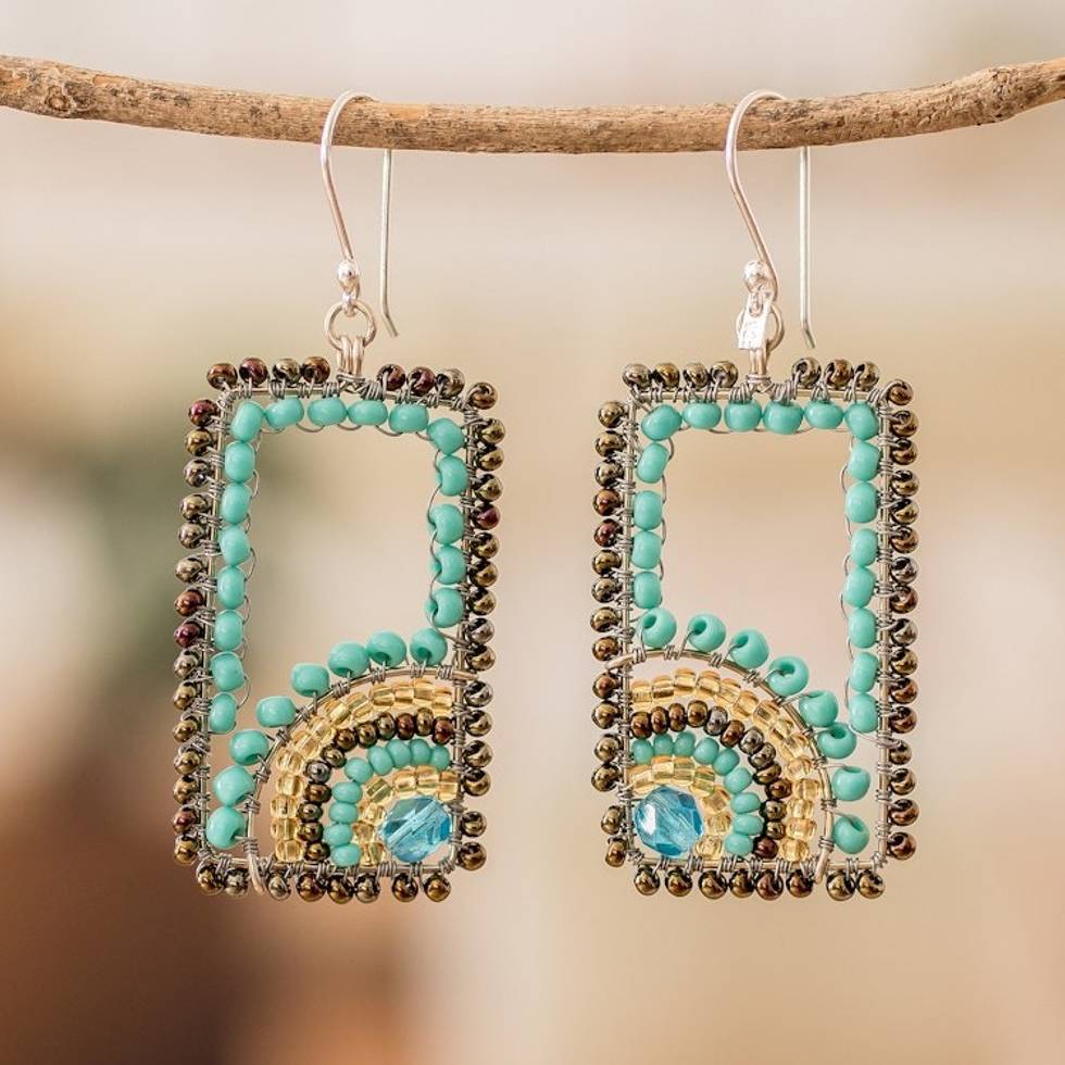Rectangular Turquoise and Golden Beaded Dangle Earrings 'Aqua Portals' Item ID: 2669923702