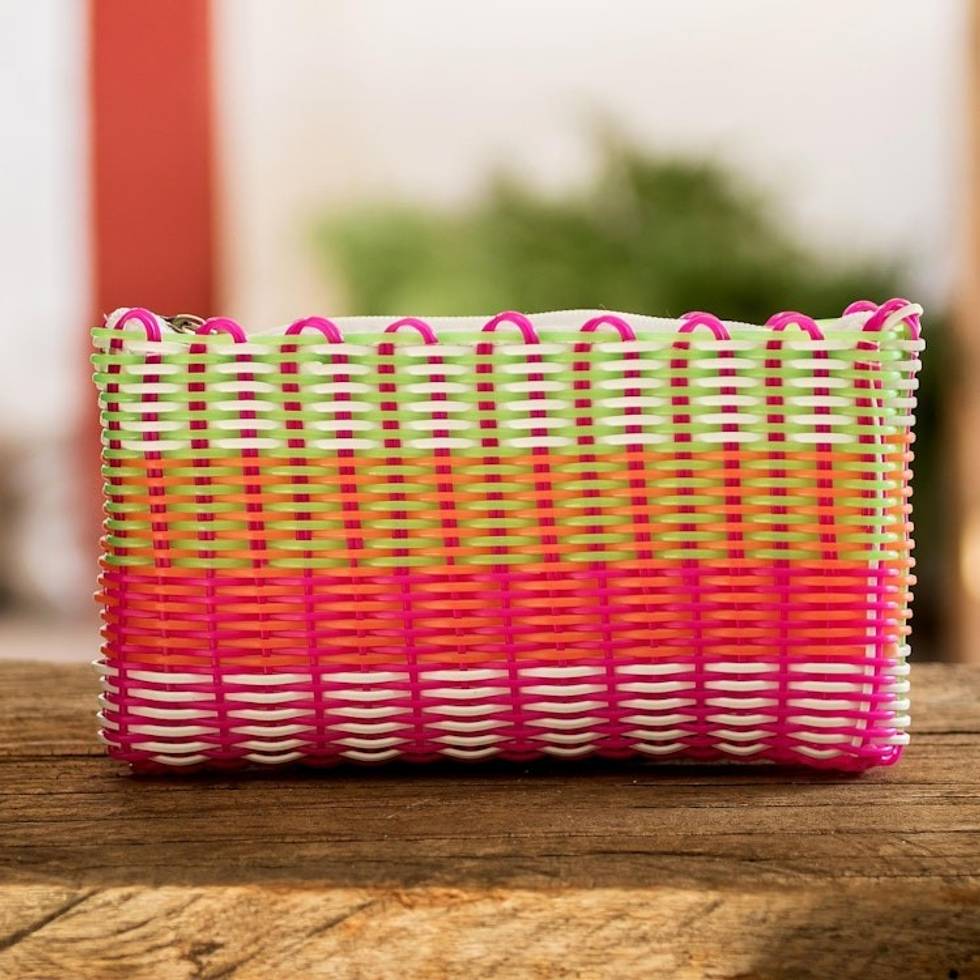 "Both playful and ecologically-responsible, this cosmetic tote combines cheerful shades of pink and fuchsia with other candy colors such as orange, white and green. Guatemalan artisan Claudia Hernandez weaves the bag by hand and lines the compact bag in white cotton."