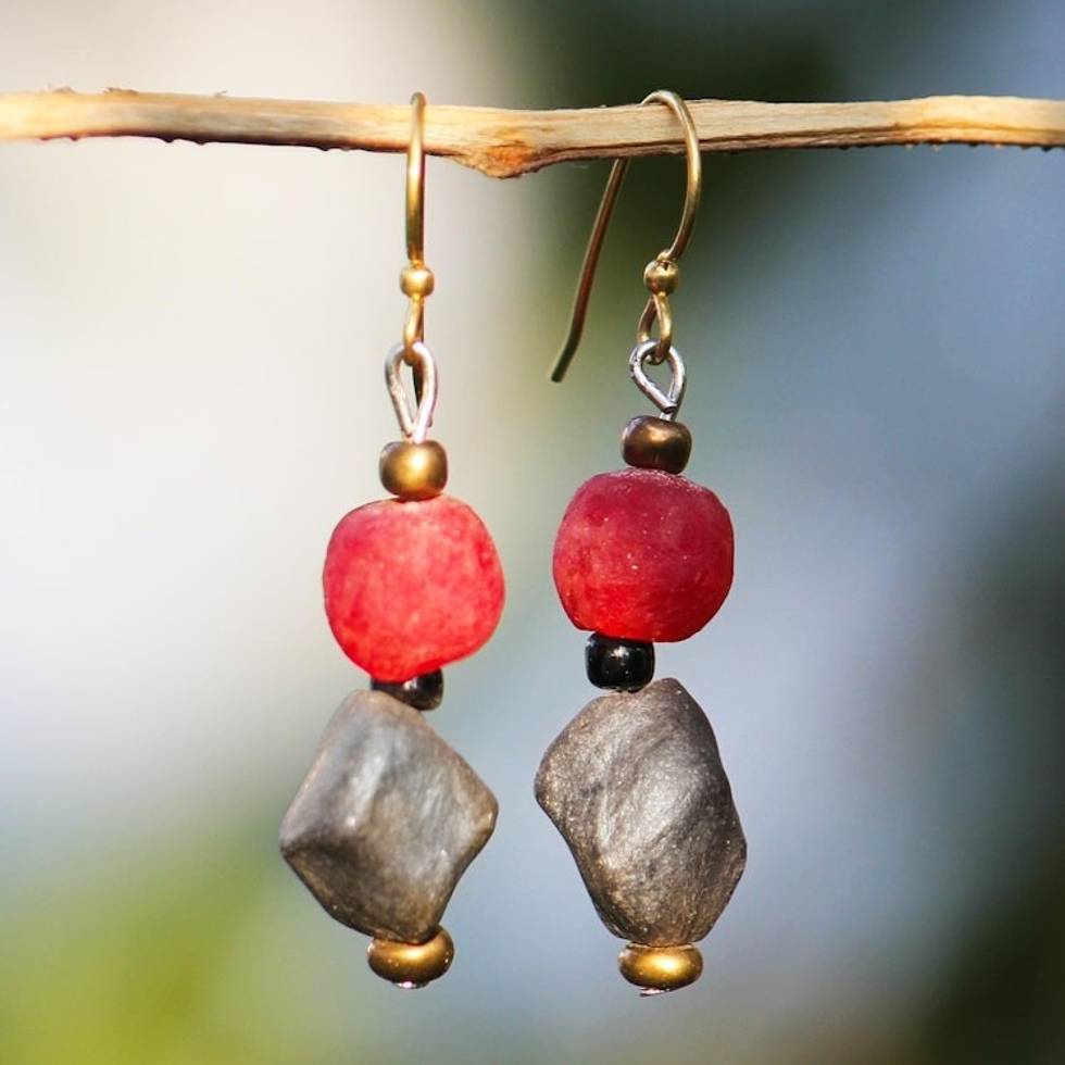 Recycled Glass and Ceramic Beaded Dangle Earrings 'Power Stones' Item ID: 2671805652
