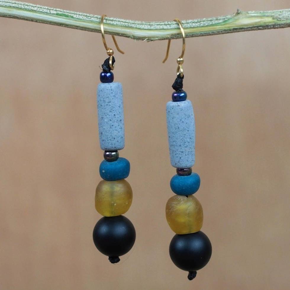 "Making a statement for environmental responsibility, Ghanaian artisan Nonyem Abena Ibeneme beads this pair of dangle earrings with glass and plastic recycled from drinking bottles in tones of blue, amber, and black. Each earring is suspended from a brass hook."