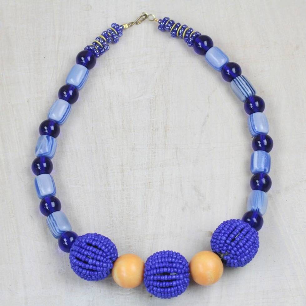 Recycled Glass and Plastic Beaded Pendant Necklace in Blue 'Grateful' Item ID: 2671806299