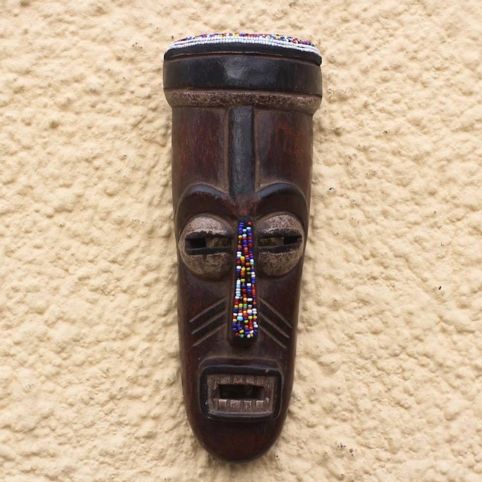 Recycled Glass Beaded African Wood Mask from Ghana 'Urhobo Festival' Item ID: 2671816232