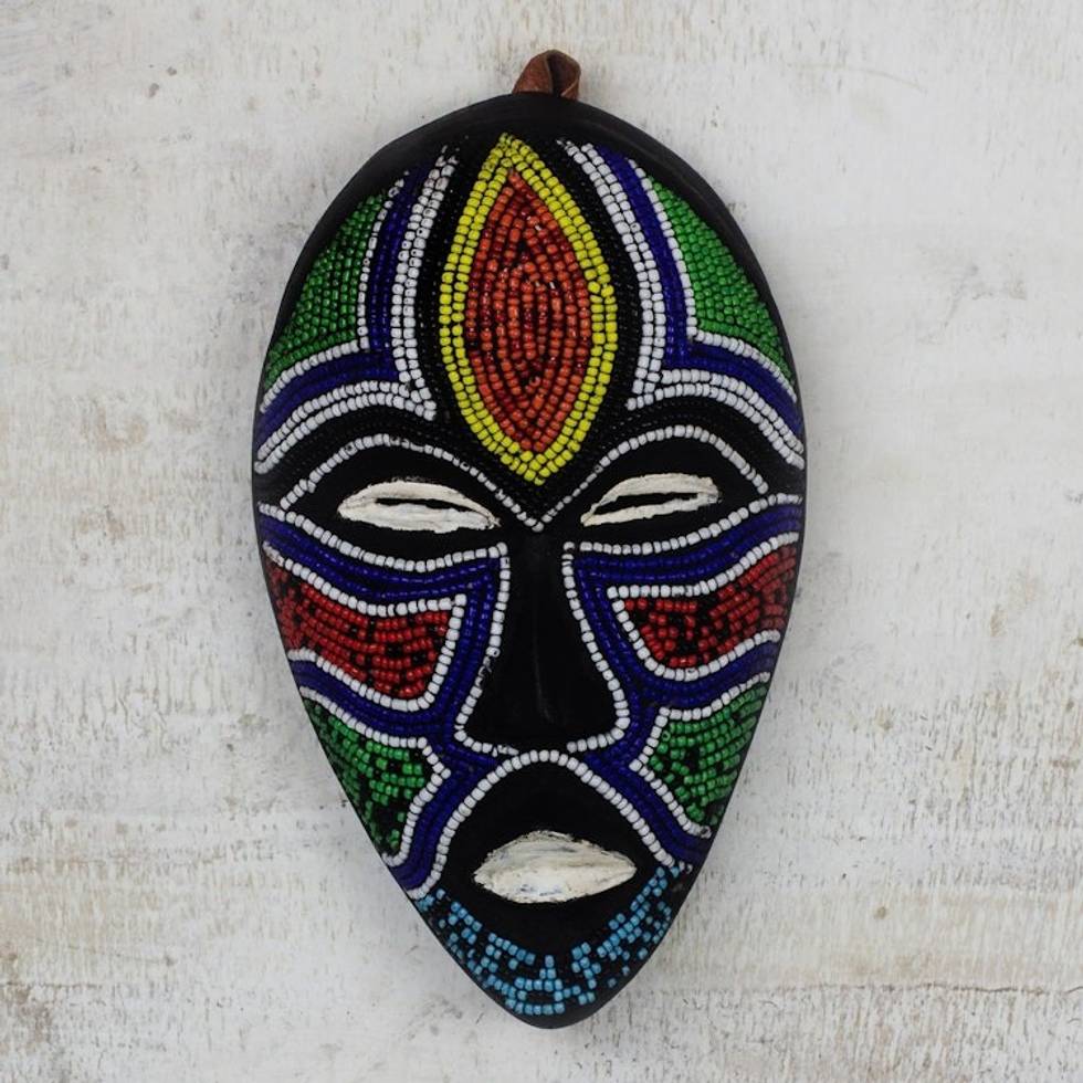 Recycled Glass Beaded African Wood Mask from Ghana 'Face of Colors' Item ID: 2671806408