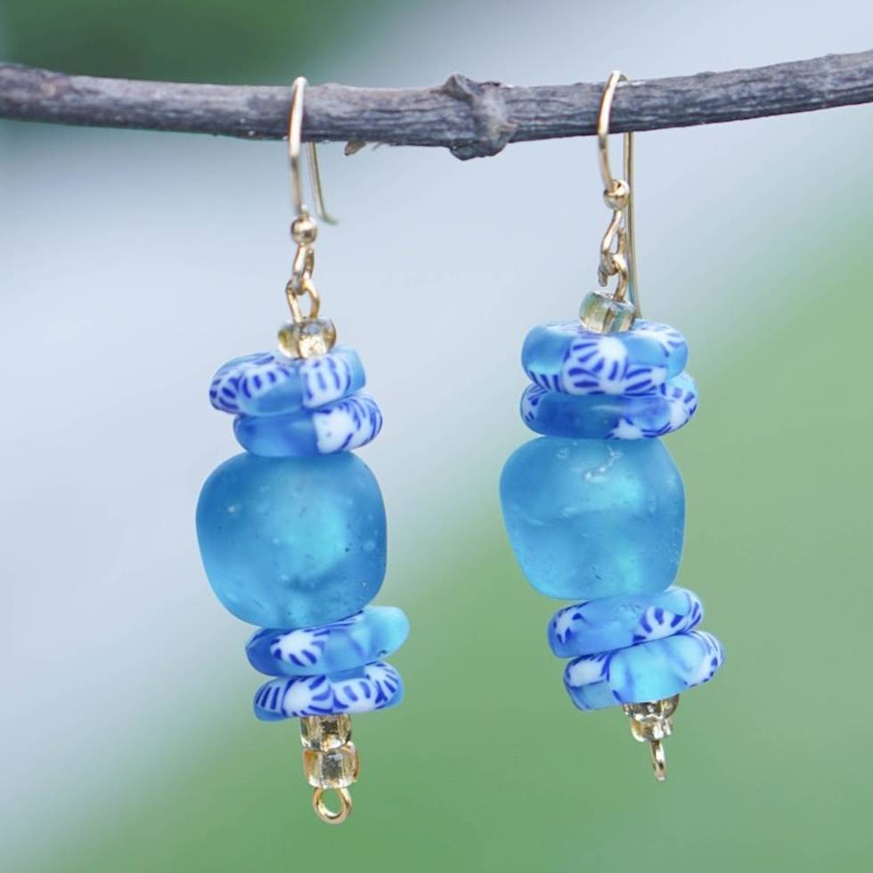 Recycled Glass Beaded Dangle Earrings in Light Blue White 'Sky Bound' Item ID: 2671804124