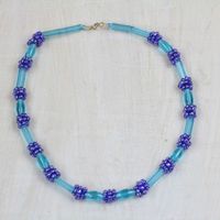 "Alternating with light blue beads and blue clusters, this Ghanaian necklace circles the wearer with recycled glass. Favour Uche designs this eco-friendly accessory."