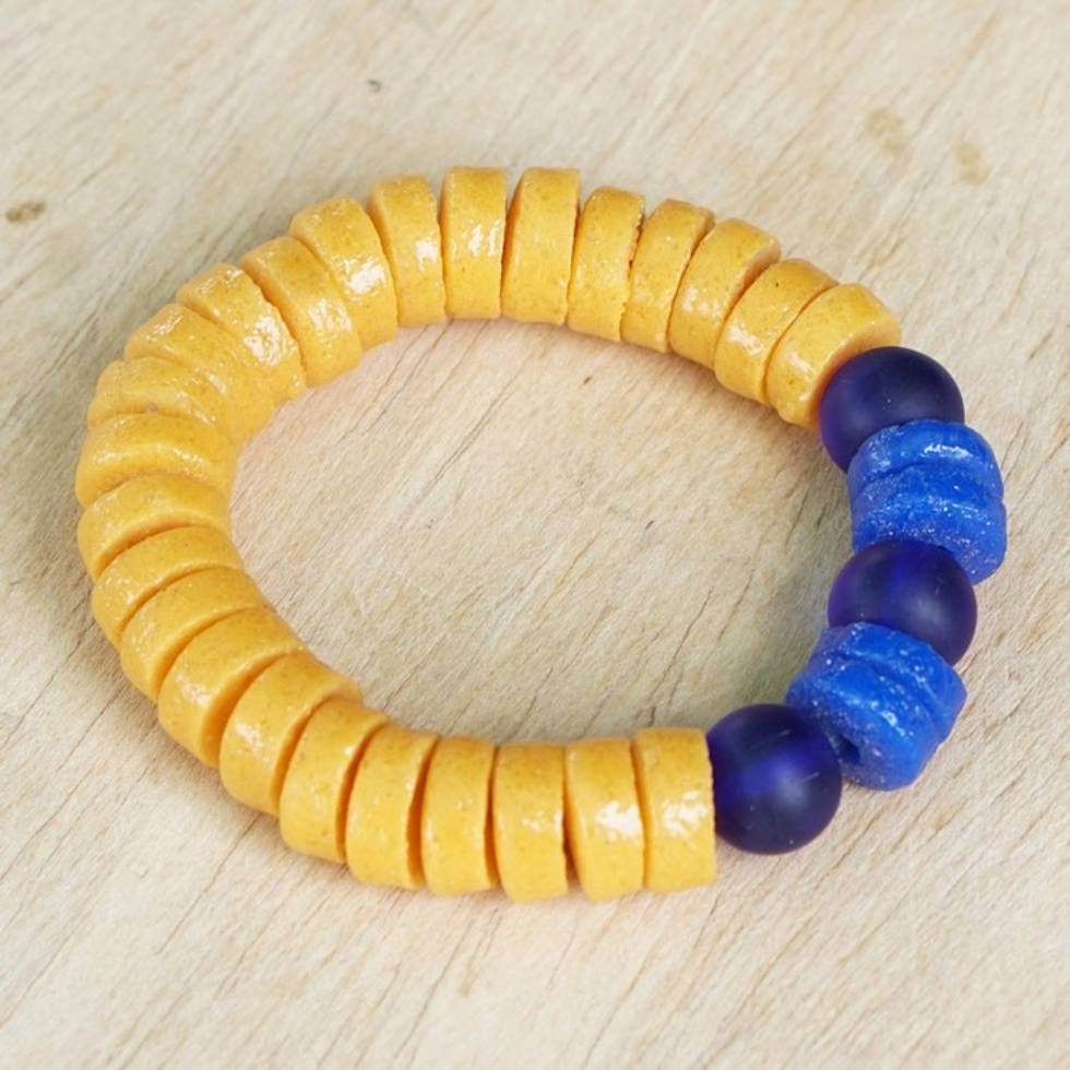 Recycled Glass Beaded Stretch Bracelet in Yellow and Blue 'Yellow Joy' Item ID: 2671804067
