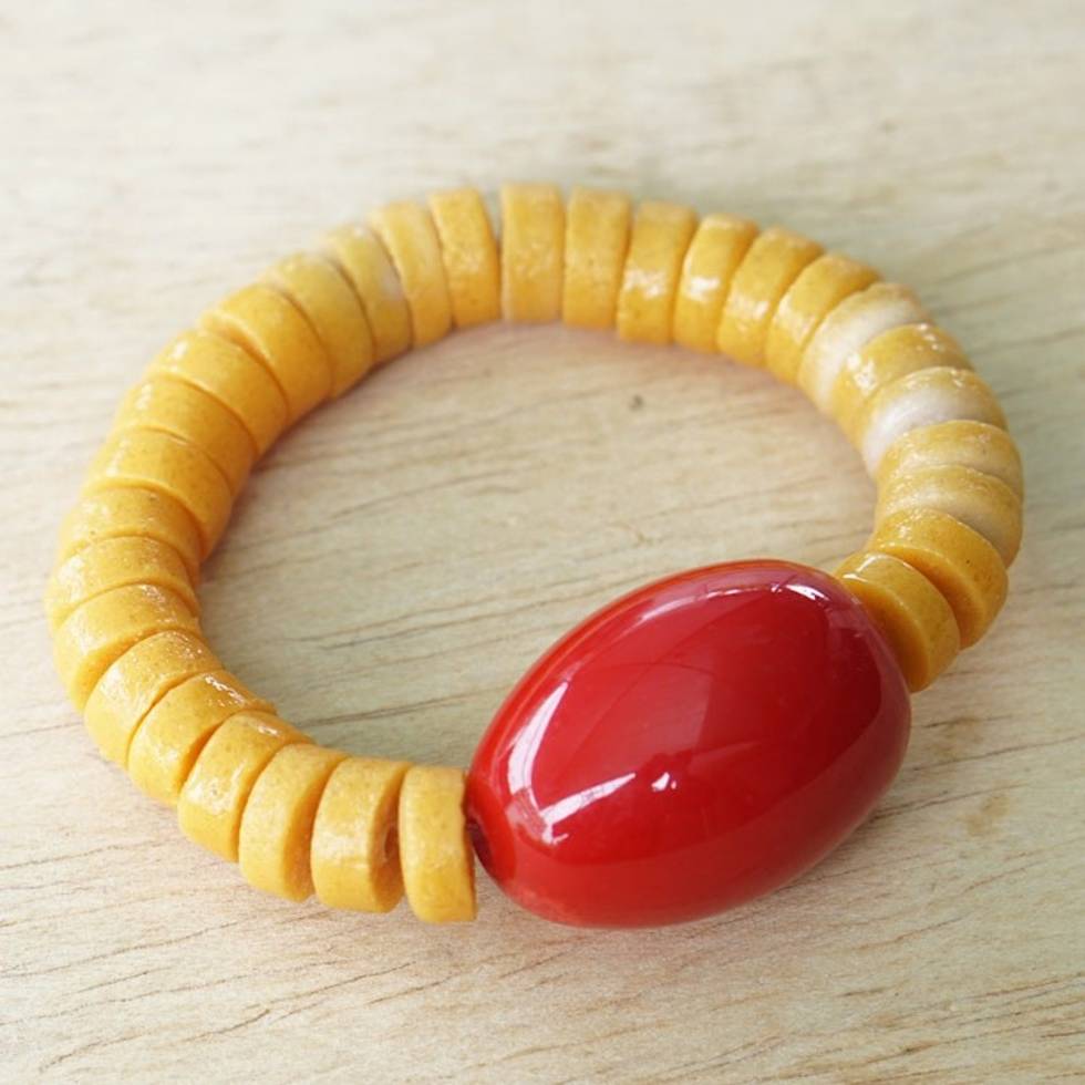 Recycled Glass Beaded Stretch Bracelet in Yellow and Red 'Red Friendship' Item ID: 2671804771