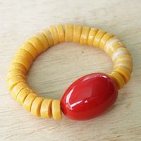 "A vibrant red bead crowns a stylish design directly from Ghana. Presented by Eva Asantewa Amakye, this eco-friendly stretch bracelet is made from recycled glass beads, which helps the environment become a greener place. As a bold touch, the central bead is complemented with yellow discs, symbolizing friendship."