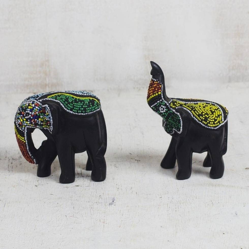 Recycled Glass Beaded Wood Elephant Figurines Pair 'Eco Elephants' Item ID: 2671806384