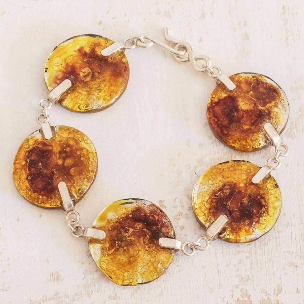 "Crafted by hand of recycled glass, five yellow moons encircle the wrist in this link bracelet from Costa Rica. Grettel Sandoval designs this eco-friendly accessory, which is crafted with high-polish sterling silver."