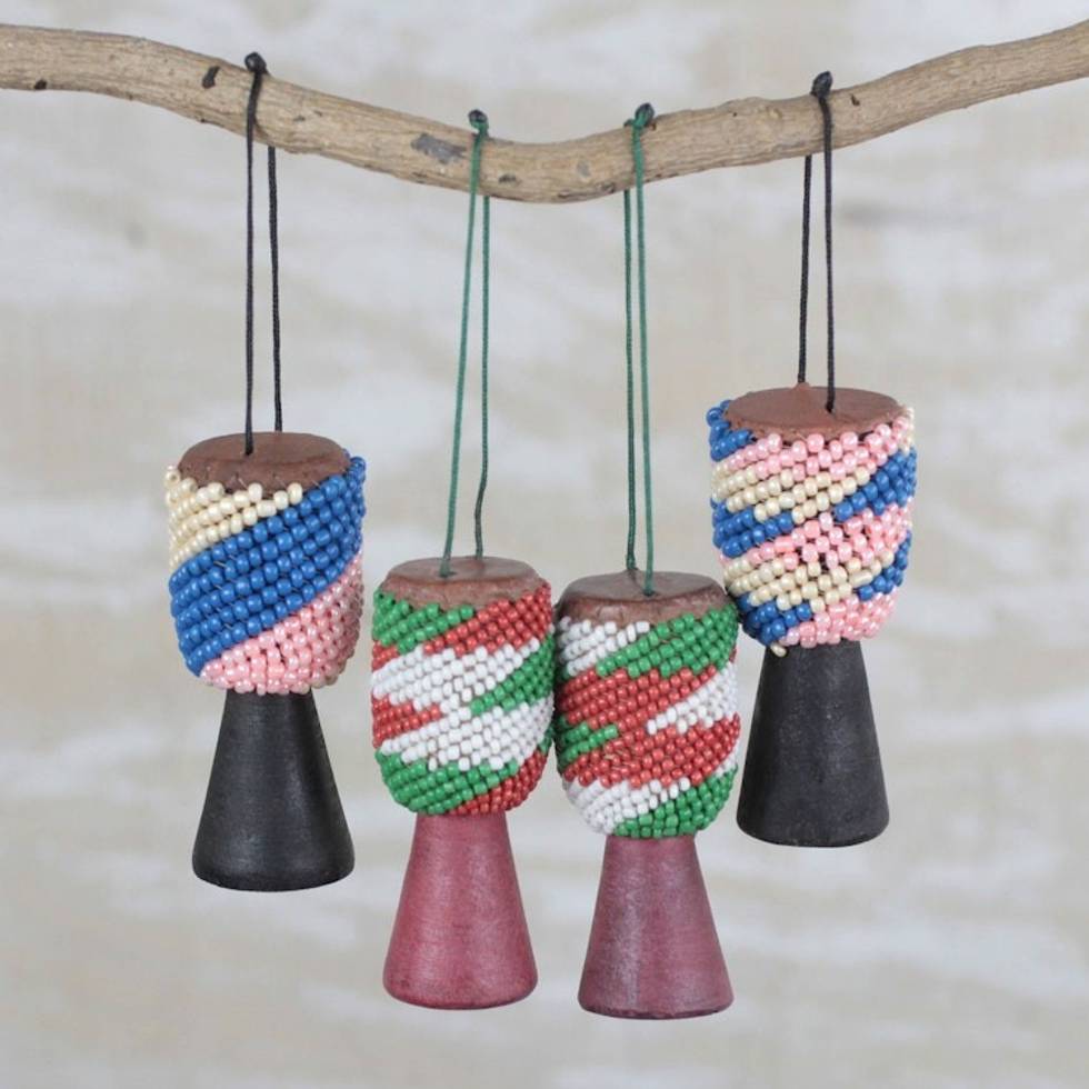 Recycled Glass Wood Beaded Drum Ornaments Set of 4 'Beaded Drums' Item ID: 2671803832