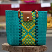 "Perfect for an impromptu picnic, a trip to the farmer's market or a visit to the library, this cool tote is the original creation of the Ciudad Bolivar artisans in Colombia. They weave the turquoise, yellow and black bag from recycled strips of PET polyethylene, adding a flap and straps of brown faux leather and gold-toned hardware."