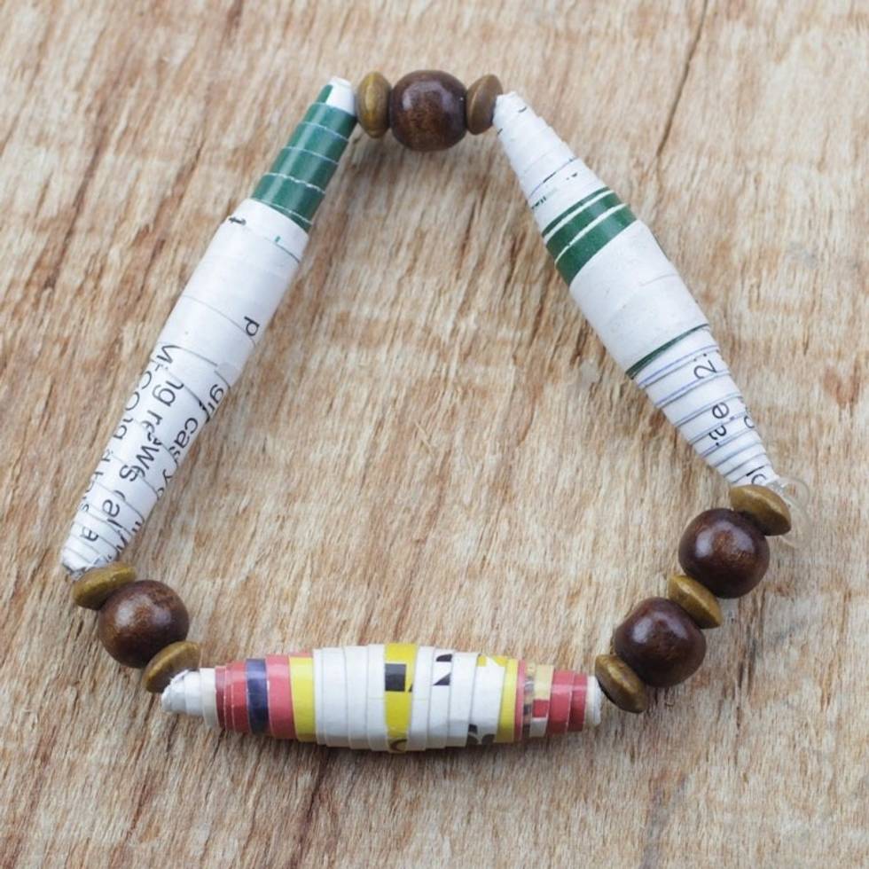 Recycled Paper and Sese Wood Beaded Stretch Bracelet 'Me and the World' Item ID: 2671803895