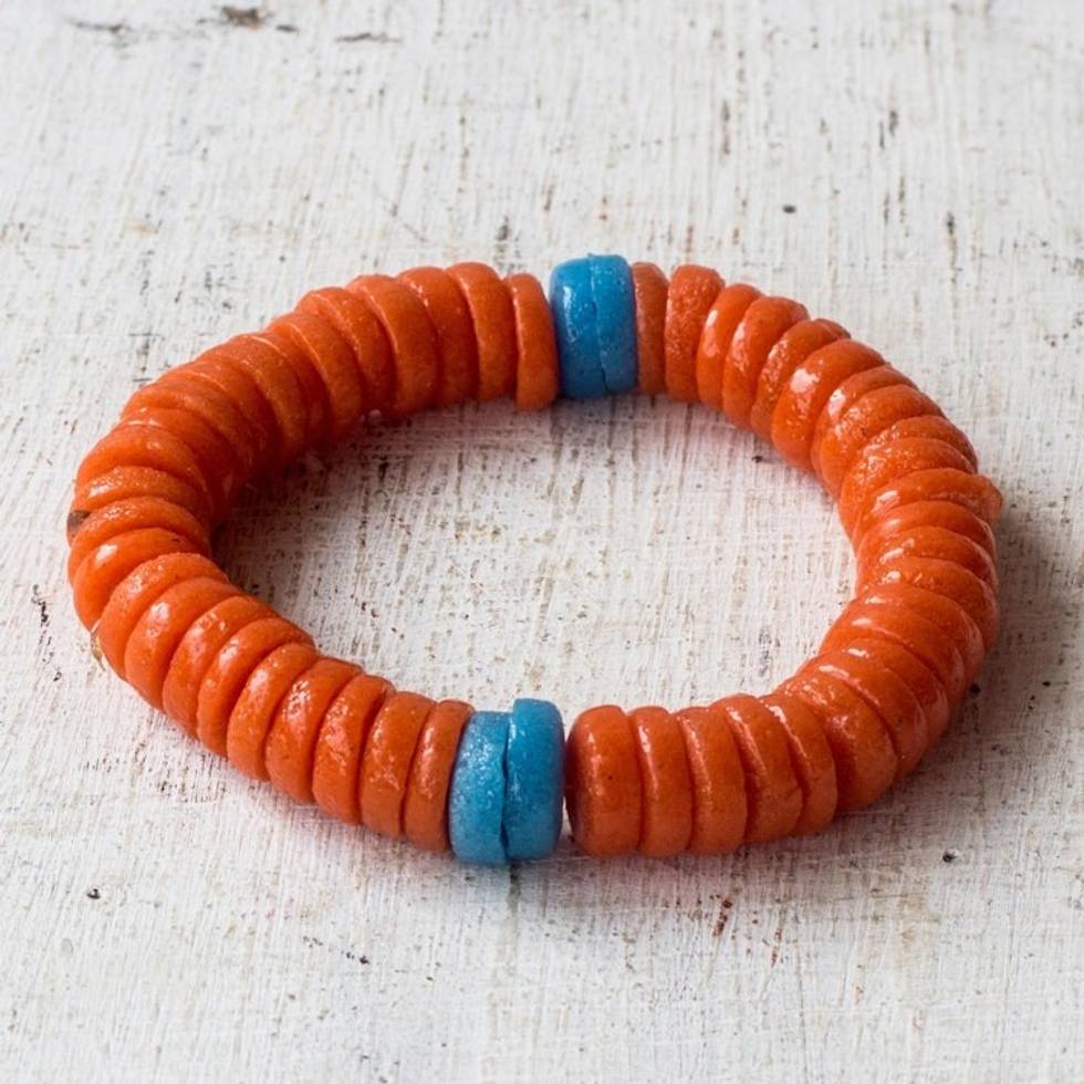 Recycled Plastic Beaded Stretch Bracelet in Orange and Blue 'Eco Orange' Item ID: 2671806007
