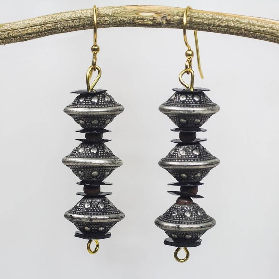 Recycled Plastic Silver Finish and Black Dangle Earrings 'Old World Allure' Item ID: 2671806164