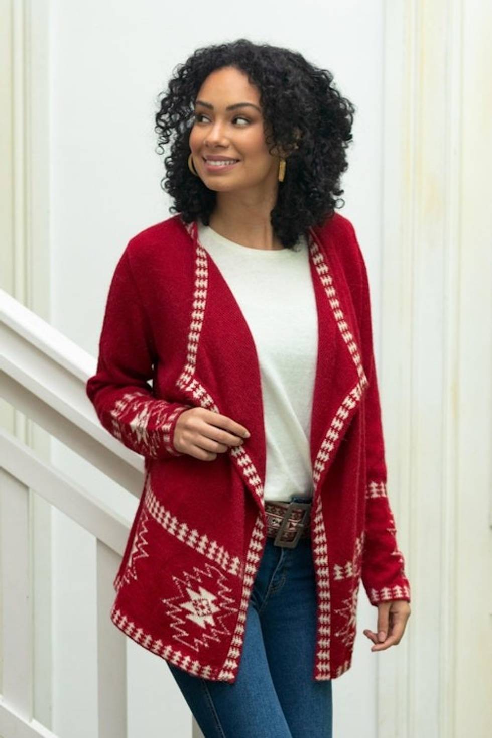 Red Alpaca Wool Cardigan with White Glyph Stars from Peru 'Glyph Stars' Item ID: 2671695681