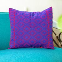 Red and Blue Brocade Cotton Cushion Cover from Mexico 'Red with Blue' Item ID: 2671807728