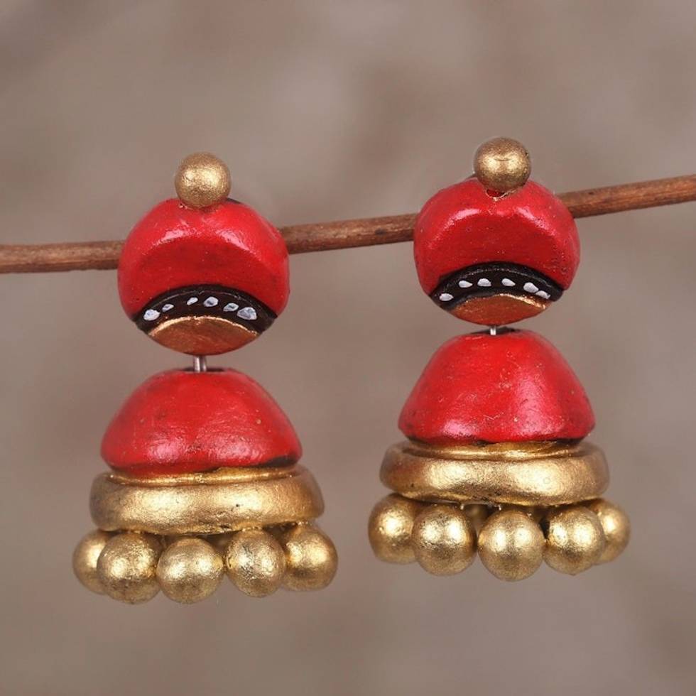 Red and Gold Jhumki Ceramic Parasol Dangle Post Earrings 'Magical Red' Item ID: 2671791192