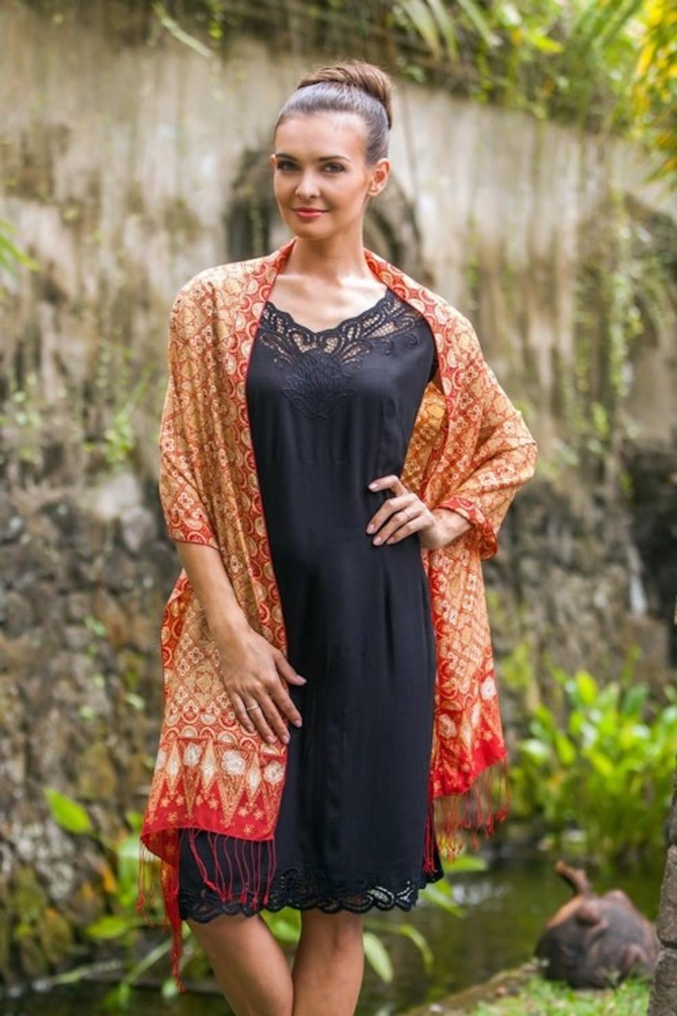 This absolutely gorgeous shawl is made from some of the finest silk I've ever had the privilege to touch. It is so soft and light, yet sturdy and the batikking is impeccable! I love the black version, as it shows up the print so beautifully! It almost has a vintage Arts and Crafts feel to the pattern. Nice enough to display in one's home - the bedroom perhaps...? I have since thought of getting another color either for myself or a very good friend or family member...well worth it.